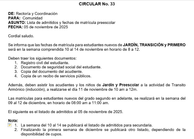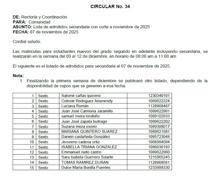 Lista de admitidos SECUNDARIA – Circular No. 34
