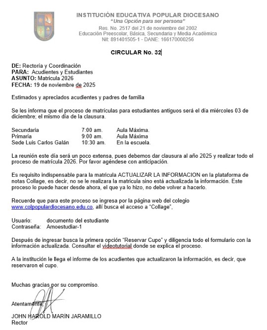 La Institución Educativa Popular Diocesano convoca a las personas interesadas en el manejo del espacio de impresiones y artículos escolares de la institución, a presentar propuestas para la entrega de la misma en concesión, por el término de diez (10) meses correspondientes a los meses de febrero a noviembre de 2026.