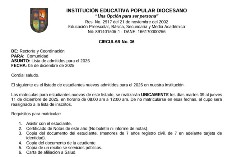 La Institución Educativa Popular Diocesano convoca a las personas interesadas en el manejo del espacio de la tienda escolar de la institución, a presentar propuestas para la entrega de la misma en concesión, por el término de diez (10) meses correspondientes a los meses de febrero a noviembre de 2026.